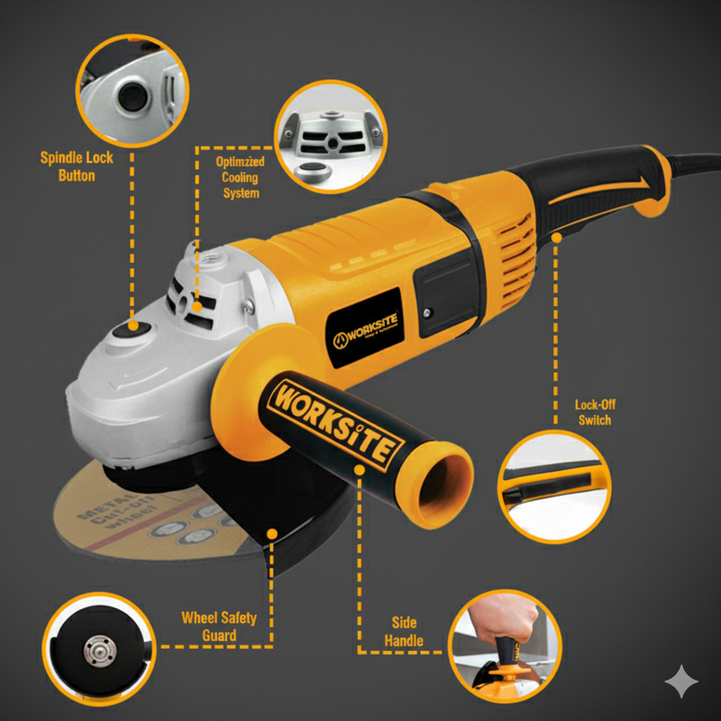 - Pin Spanner (Wrench): The specialized tool used to tighten and loosen the locking flange/nut when changing grinding or cutting discs.