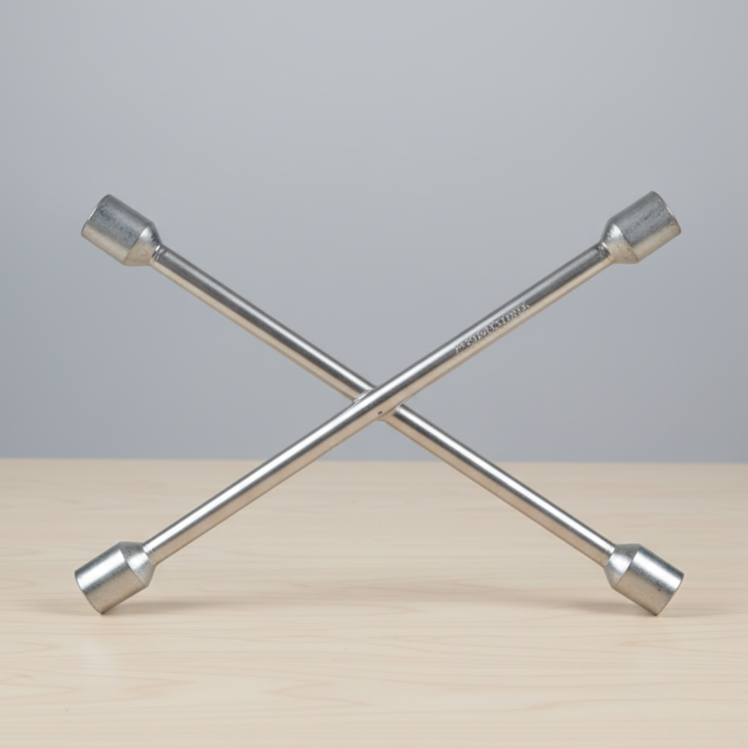 The Cross Wrench is designed for efficient and powerful removal or installation of lug nuts on vehicle wheels. Its distinct four-arm cross pattern allows the user to apply torque from two opposing points, generating much more leverage than a standard wrench. This is crucial for breaking loose rusted or overtightened lug nuts, especially in emergency situations.