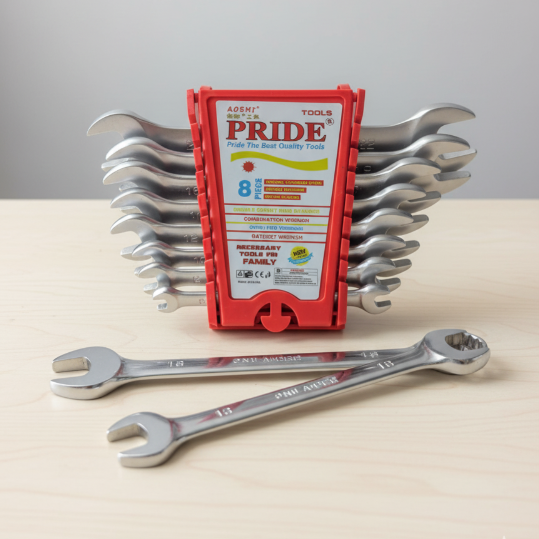 The PRIDE AOSHNI 8-Piece Combination Wrench Set is made from premium Chrome Vanadium Steel with a Mirror Polished finish for superior strength and durability. This set includes all essential sizes in a convenient, fold-out holder, giving you both open-end and ratcheting box-end options for every job. A must-have for mechanics and serious DIYers.