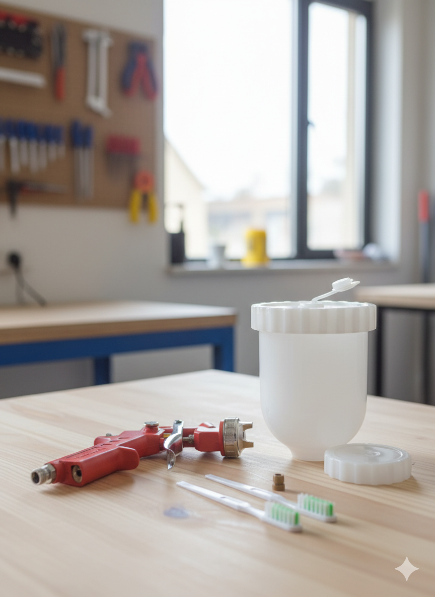 The “Gravity Feed” design means the material cup sits on top of the gun, allowing gravity to assist in feeding the paint to the nozzle.