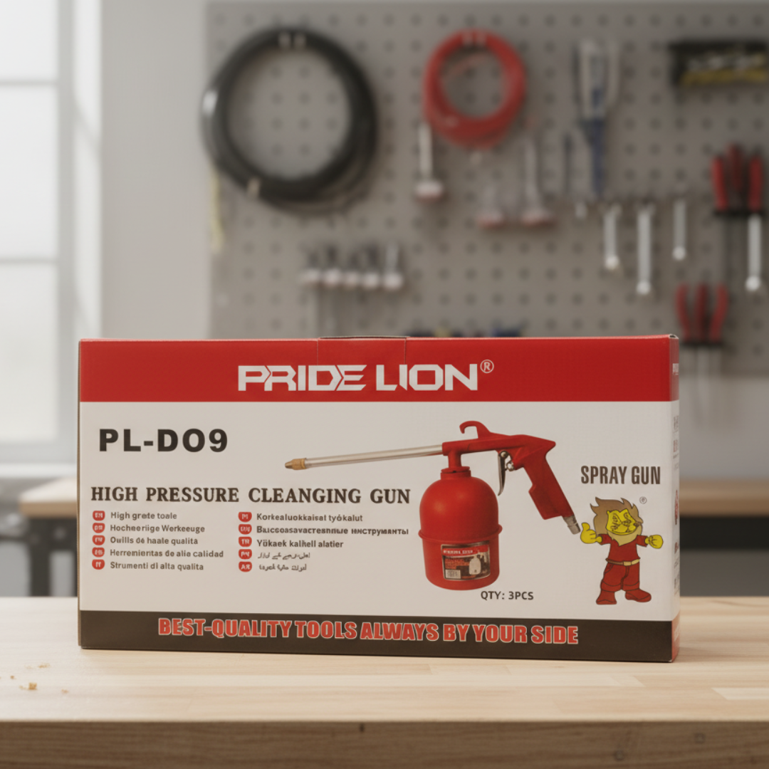 This High-Pressure Cleaning Gun operates by drawing cleaning fluid from the attached red reservoir and mixing it with compressed air from an external source (air compressor). The resulting powerful spray is capable of removing tough grease, oil, and grime from hard-to-reach areas.